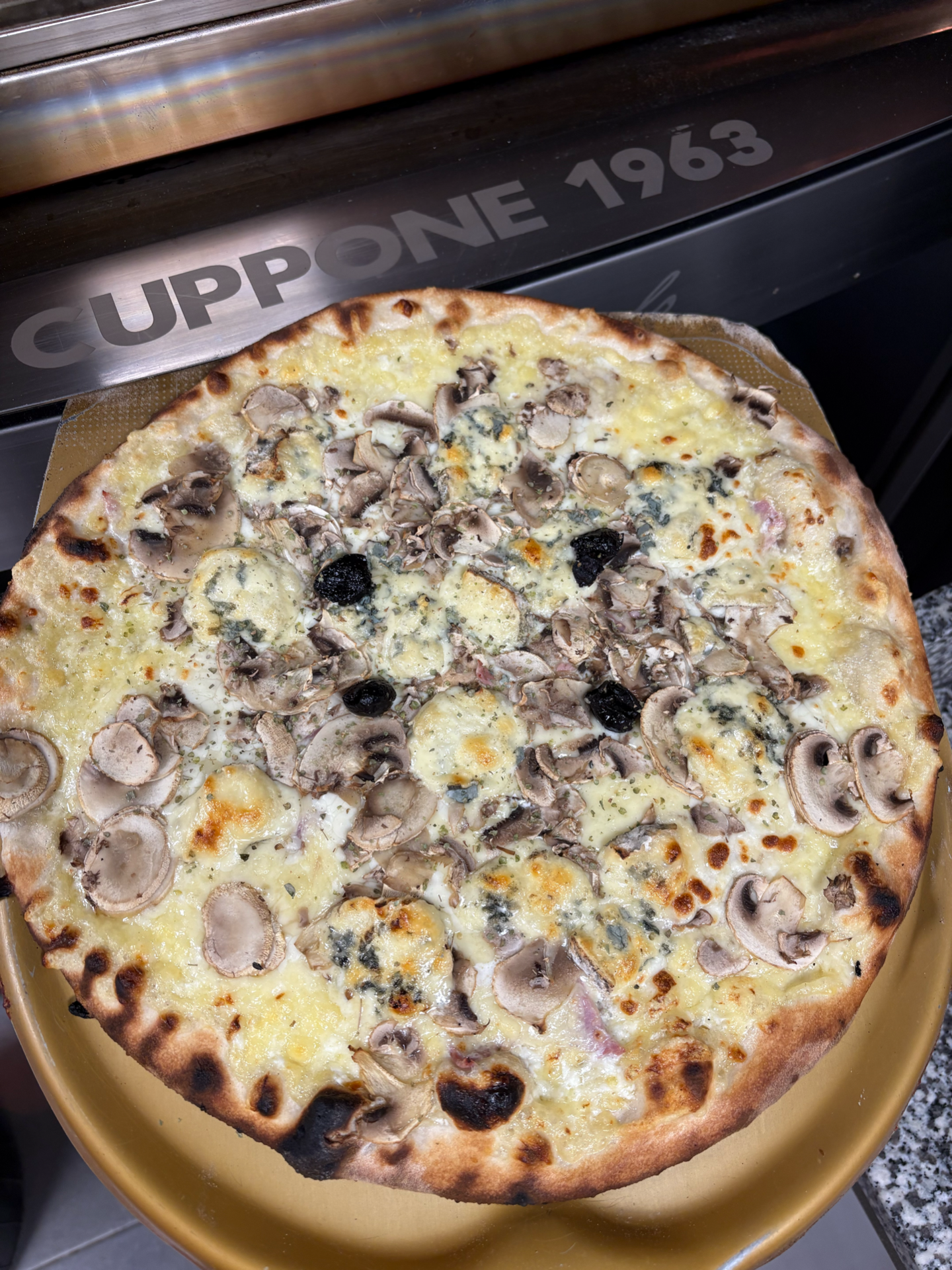 Crème fraiche, emmental, mozzarella, jambon, champignons, roquefort, olives