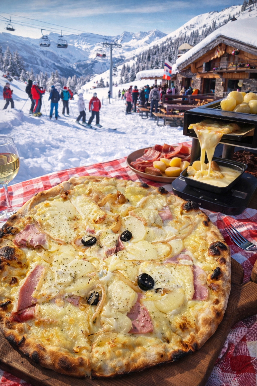 Crème fraiche, emmental, pommes de terre, oignons jaune, fromage à raclette, 1 charcuterie au choix (jambon blanc ou jambon cru, ou chorizo ou figatelli), olives